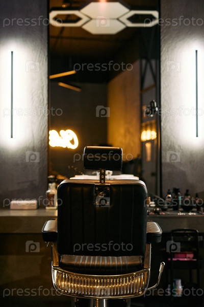 Пустой парикмахерский стул, стоящий перед зеркалом и ожидающий следующего клиента