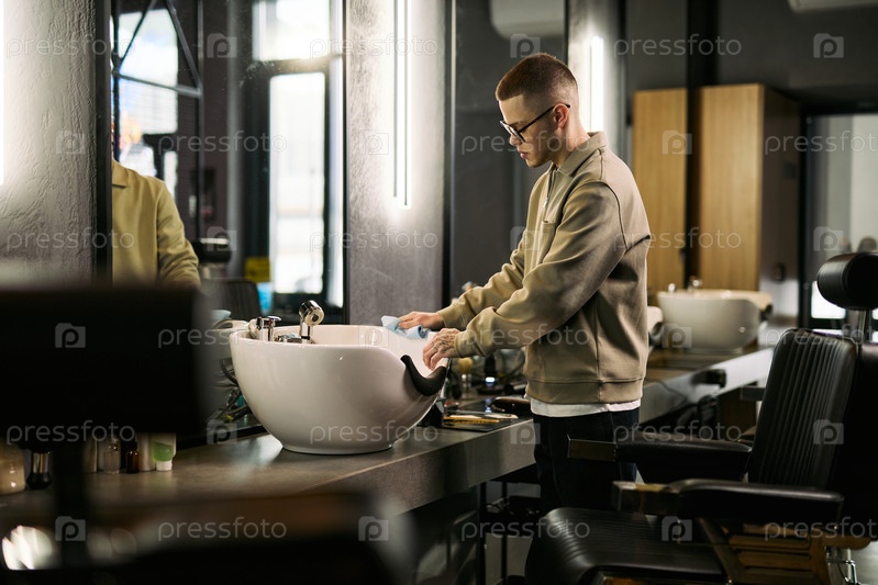 Молодой взрослый белый мужчина убирает раковину в интерьере парикмахерской во время работы