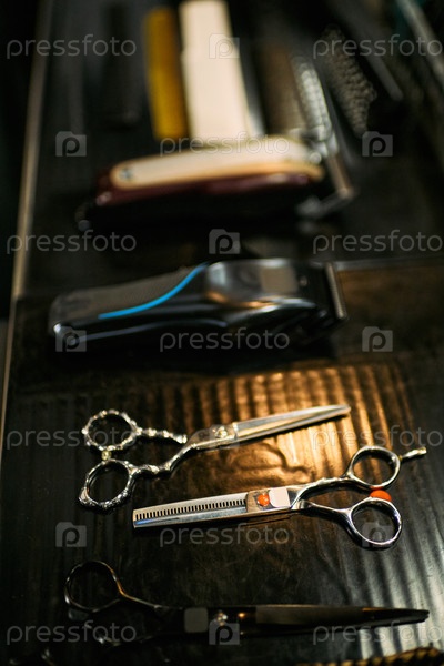 Инструменты парикмахерской, расположенные на столе, включая ножницы и стрижки для волос