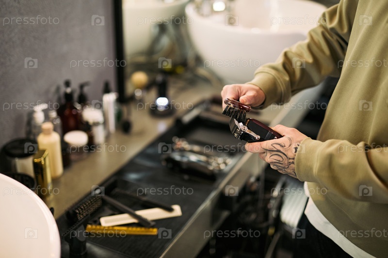 Татуированный молодой взрослый мужчина готовит электрическую стрижку в парикмахерской