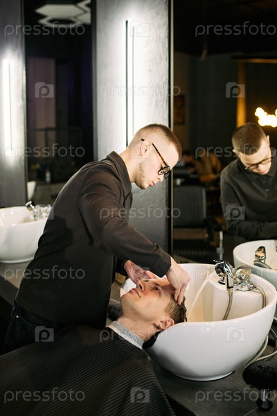 Молодой белый мужчина моет волосы молодому белому человеку в парикмахерской
