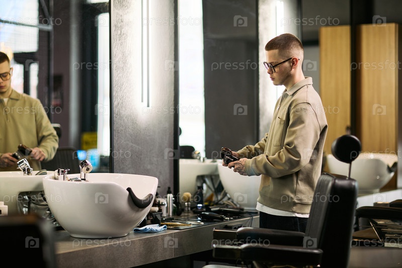 Молодой белый мужчина готовит клипперы в современном интерьере парикмахерской