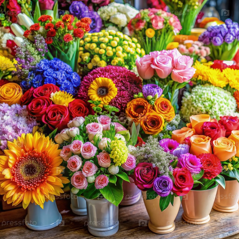 Красочные букеты цветов на экспозиции в цветочном магазине