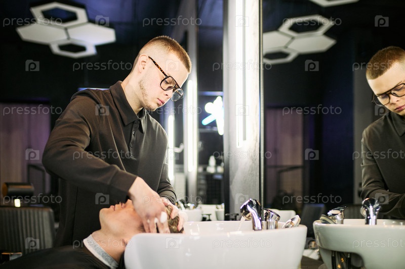 Молодой взрослый кавказский парикмахер мягко массажирует скальп клиента в умывающем бассейне