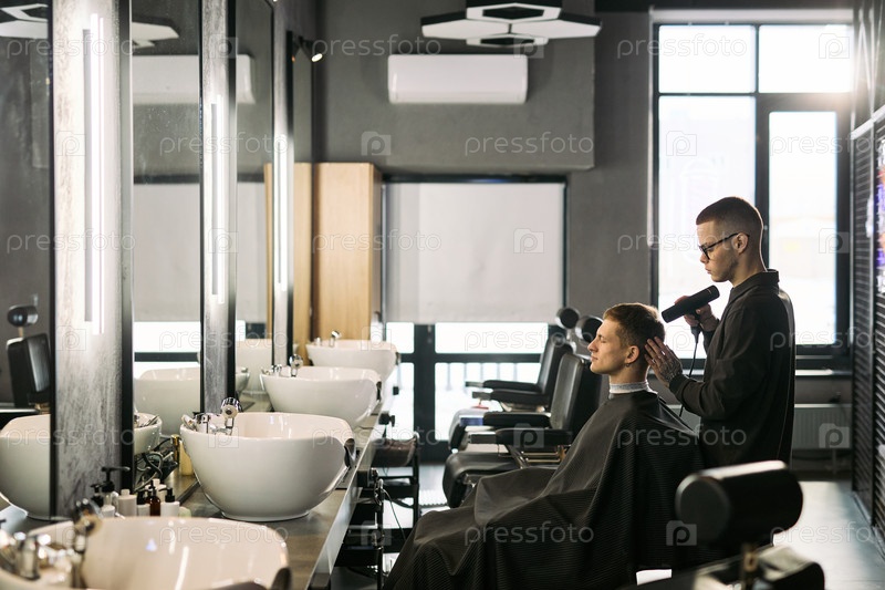 Молодой белый мужчина высушивает волосы молодого белого человека в современной парикмахерской