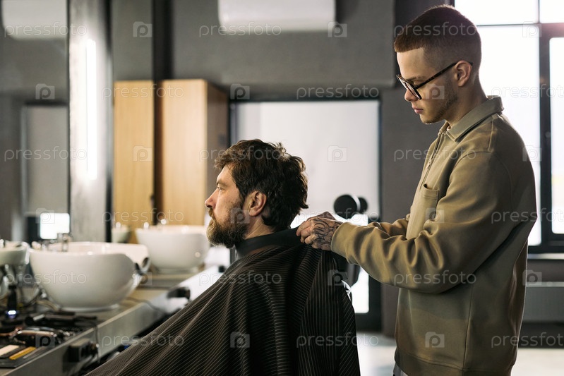 Молодой взрослый кавказский парикмахер, стригущий волосы средневекового белого мужчины в помещении