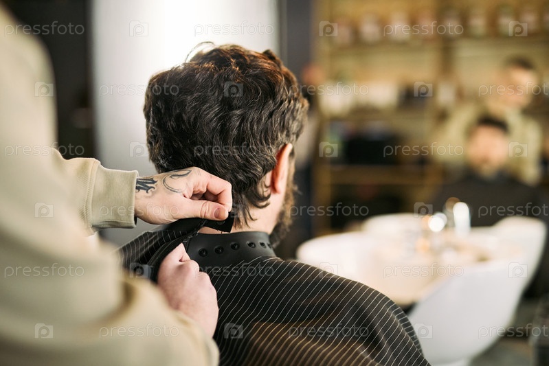 Молодой взрослый кавказский мужчина подстригается в парикмахерской с рабочим парикмахером