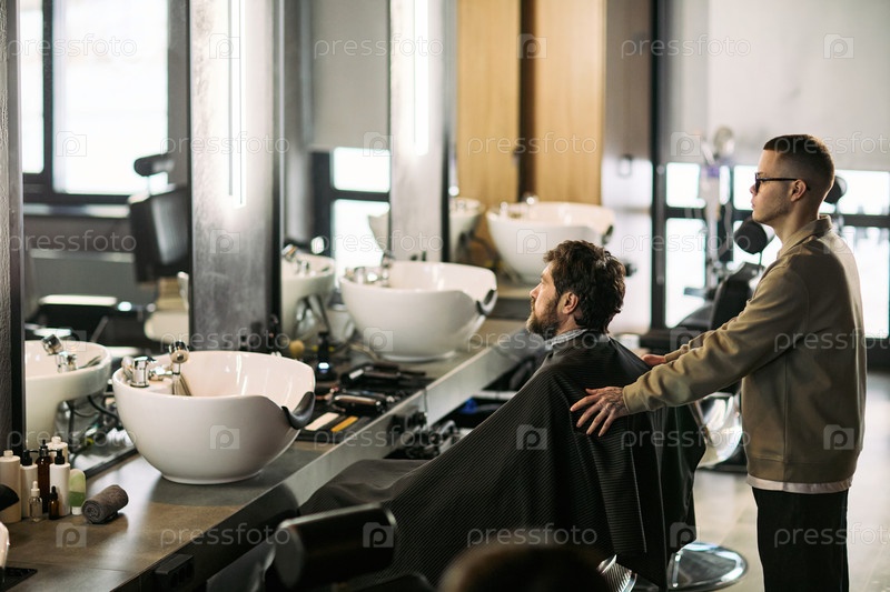 Молодой кавказский парикмахер готовит белого мужчину средних лет для стрижки в парикмахерской