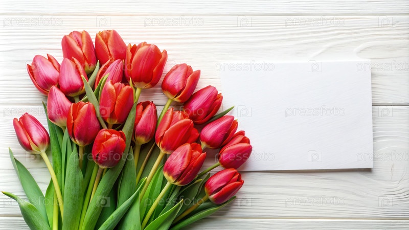 Красные тюльпаны и пустая карточка на белой деревянной поверхности