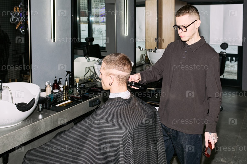 Молодой взрослый кавказский парикмахер создает современную прическу Fade на сидящем клиенте в помещении