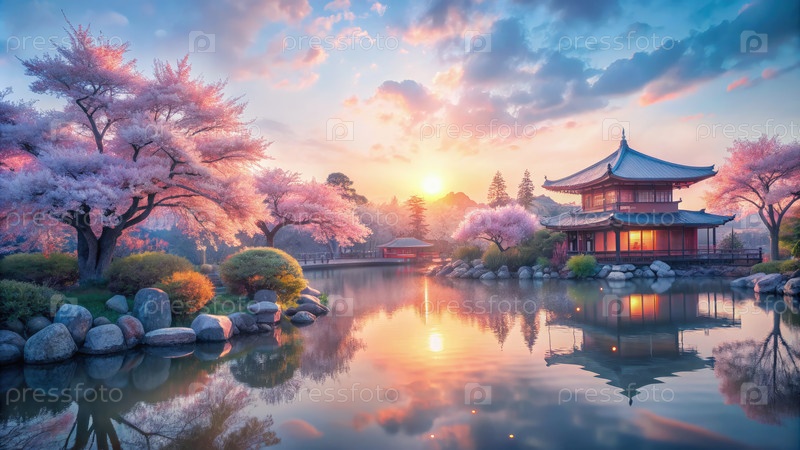 Спокойный восход солнца над цветущей сакурой в японском саду