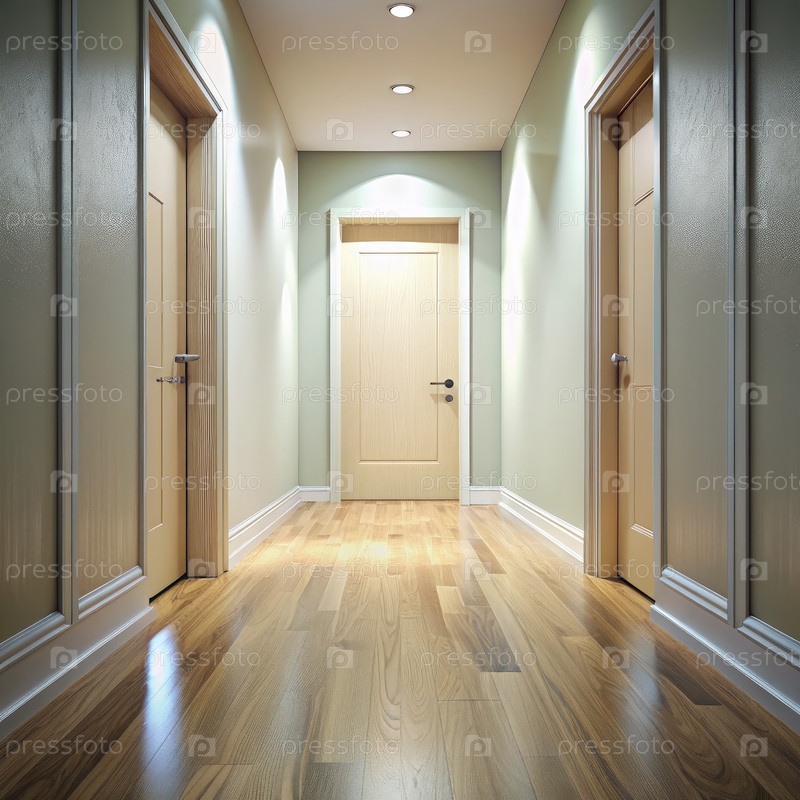 Светлый деревянный пол в коридоре с тремя дверями