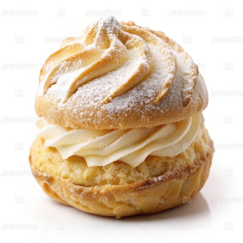 Крем-пуф с отбивным сливком и сахаром в порошке на белом фоне