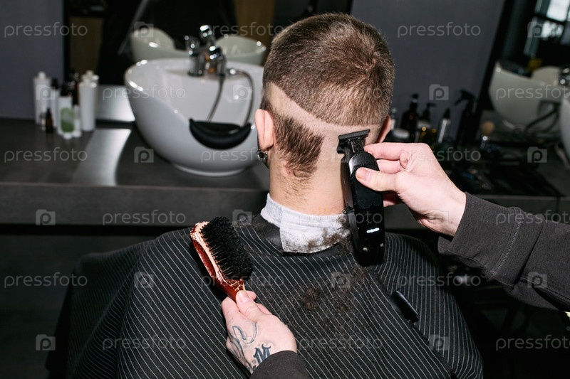 Молодой взрослый кавказский мужчина получает стрижку волос с помощью электрической клипперы в парикмахерской