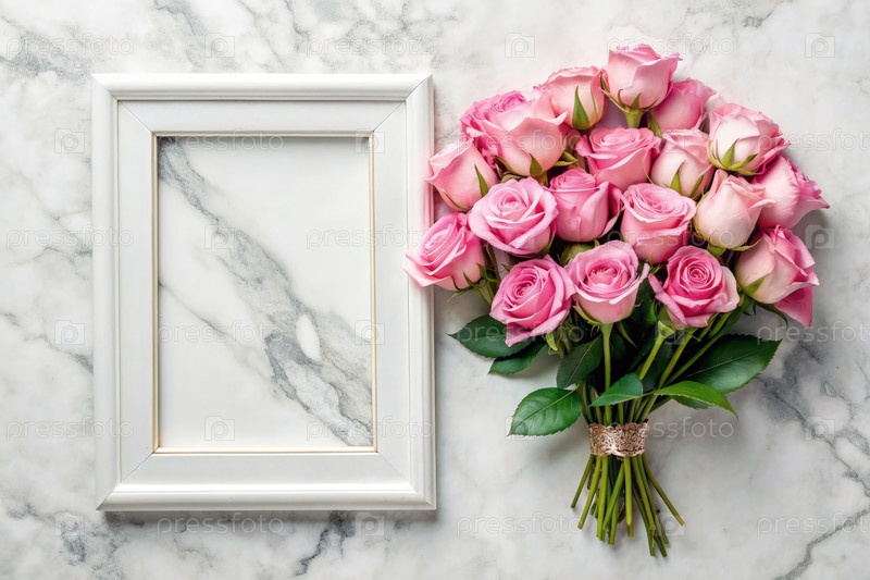 Букет розовых роз рядом с белой рамой на мраморе
