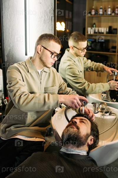 Молодой взрослый кавказский парикмахер промывает волосы бородатого мужчины среднего возраста