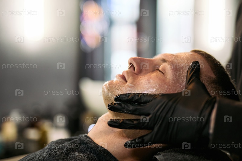 Кавказский молодой взрослый мужчина получает обращение с лицом в парикмахерской