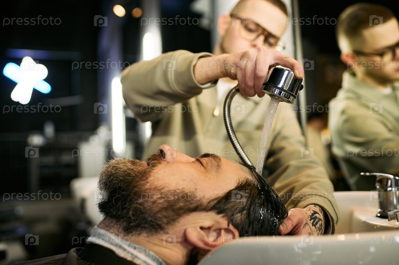 Кавказский мужчина средних лет расслабляется, пока молодой парикмахер моет волосы в парикмахерской