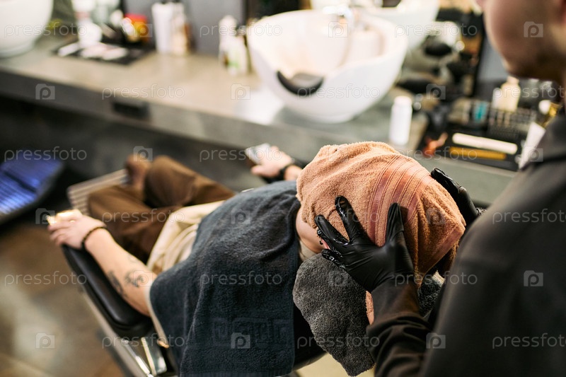 Молодой взрослый белый мужчина расслабляется во время обработки горячим полотенцем в парикмахерской