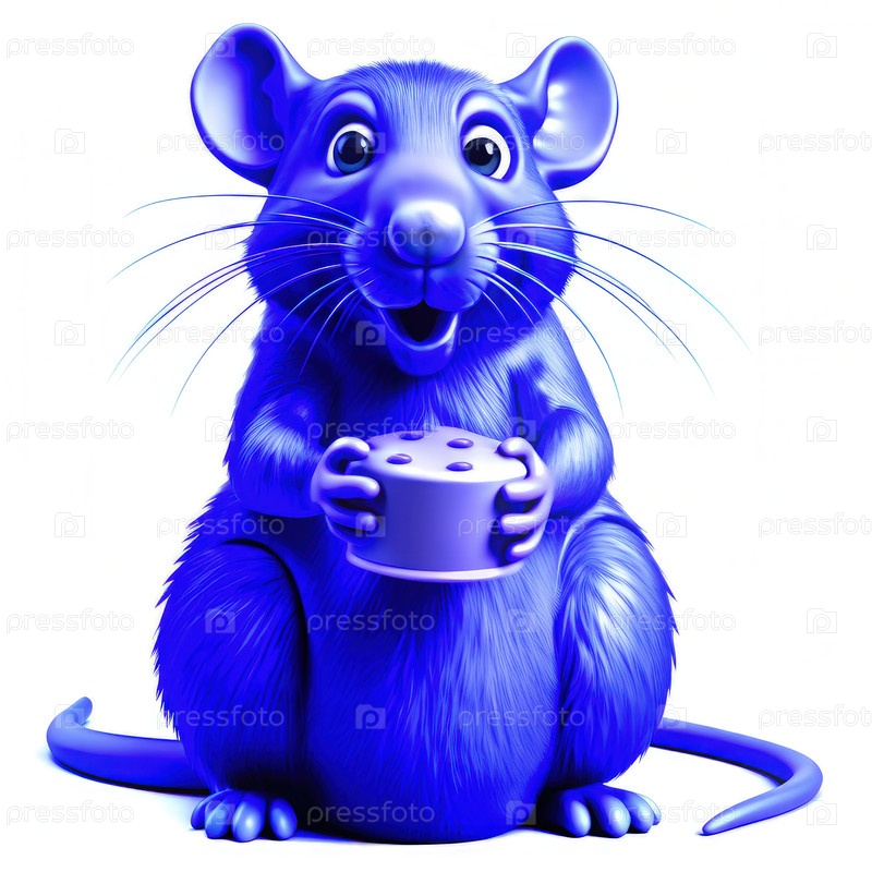 Голубая крыса держит круглое сырное колесо на белом фоне