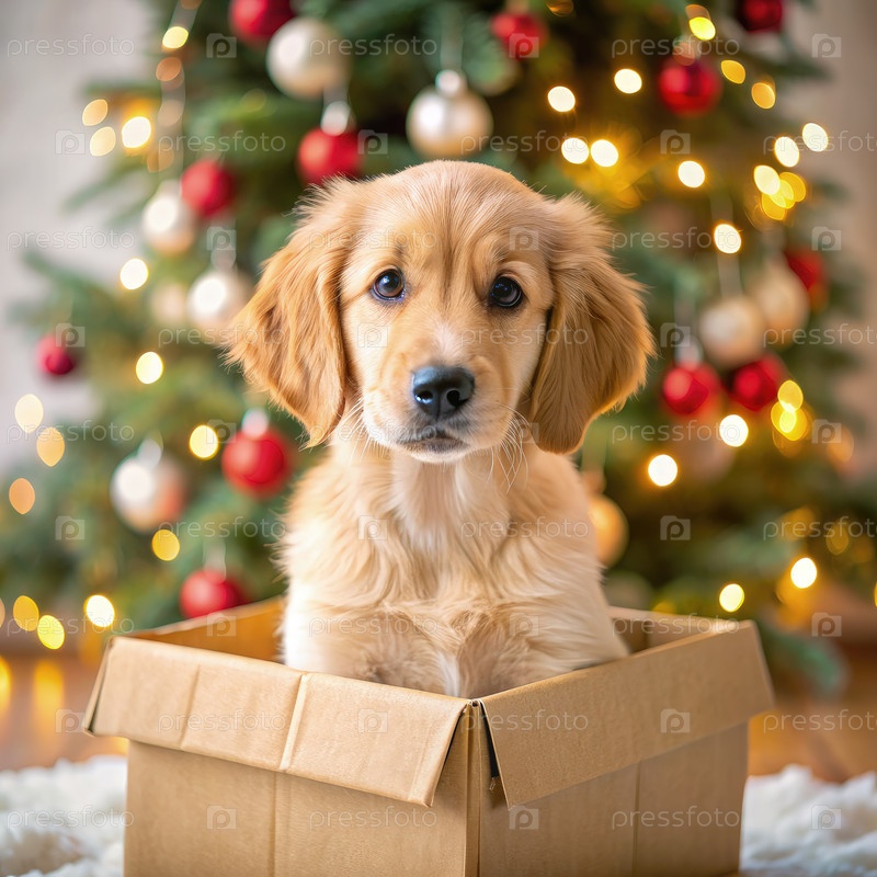 Щенок золотого ретривера сидит в коробке перед рождественской елкой