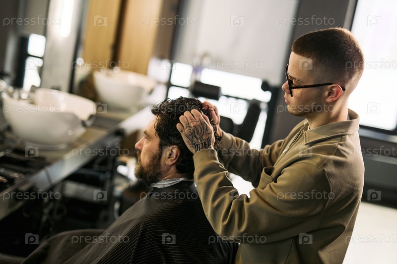Молодой белый мужчина стилизует волосы средневекового белого человека в парикмахерской