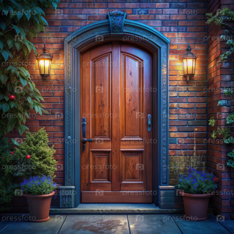 Красная деревянная дверь на кирпичной стене с украшенной отделкой