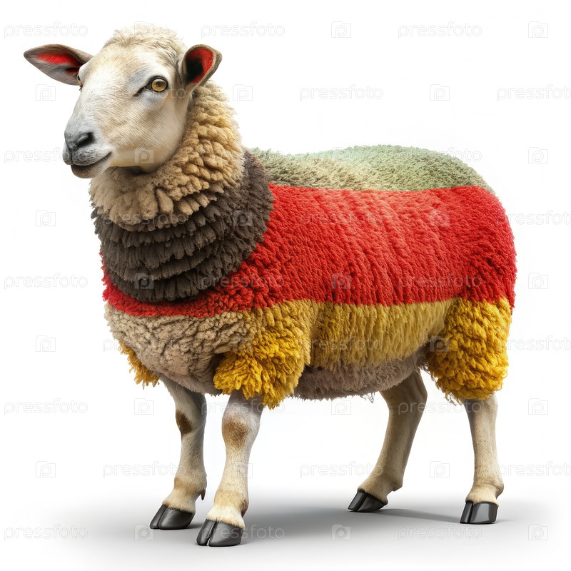 Белая овца стоит на белом фоне, обращенная слегка влево. ее шерсть окрашена в цвета немецкого флага. генератив AI