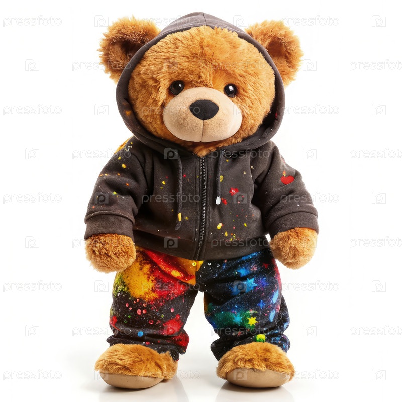 Коричневый тедди-медведь, носящий красочную краску Splatter Hoodie и брюки. генеративный AI