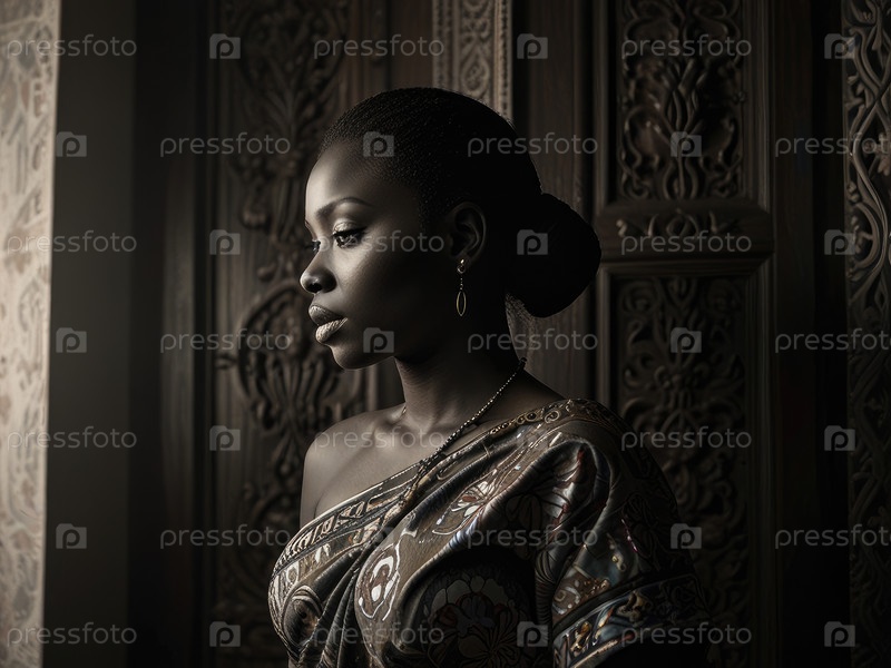 Женщина в рисунковом платье стоит перед резной деревянной дверью