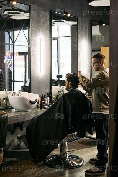 Молодой белый мужчина стрижет волосы бородатого средневекового белого человека в парикмахерской