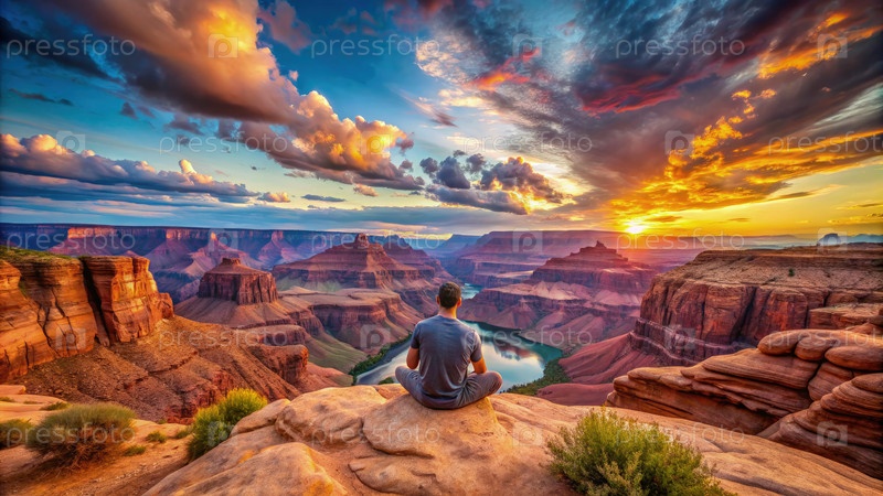 Человек созерцает драматический закат над Большим каньоном