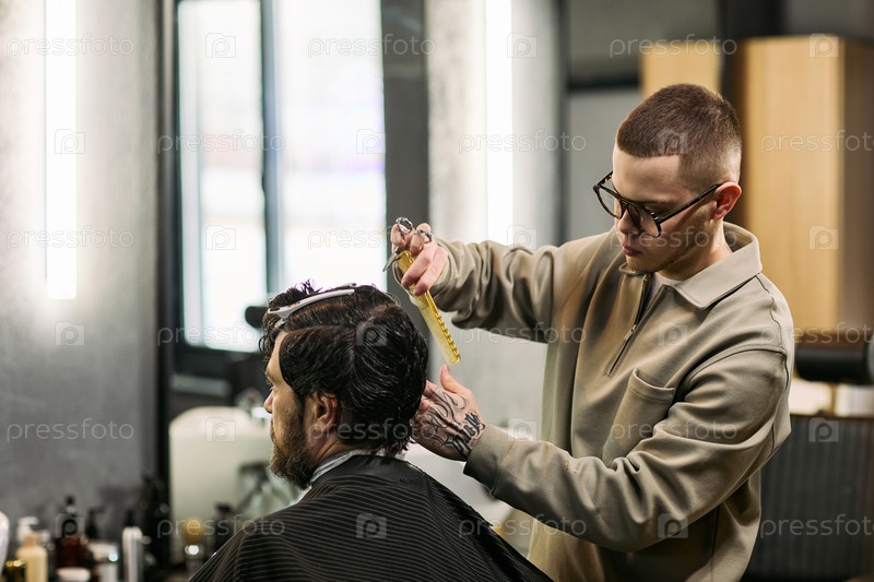 Молодой взрослый кавказский парикмахер умело обрезает волосы бородатого клиента в помещении