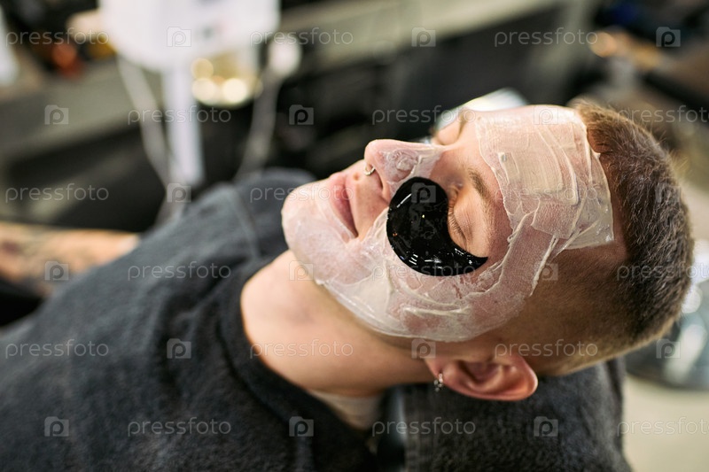 Молодой белый мужчина расслабляется во время обработки лица в парикмахерской