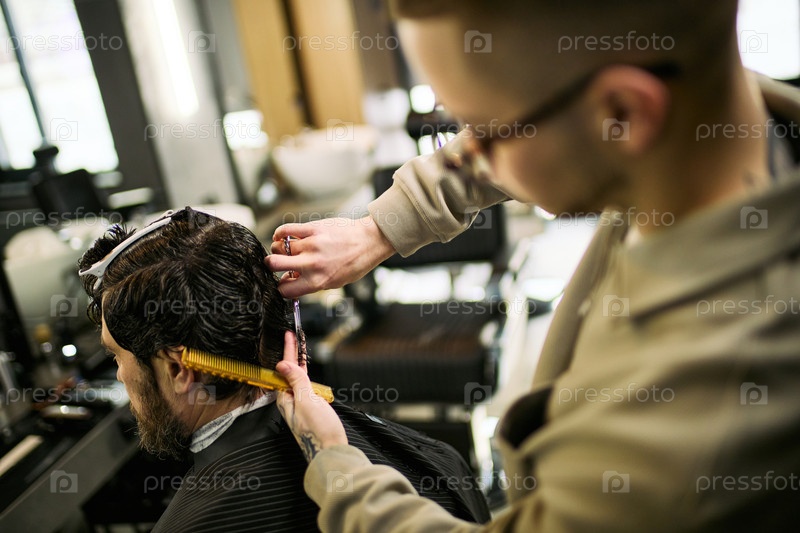 Молодой взрослый кавказский парикмахер умело стрижет волосы бородатого клиента в помещении