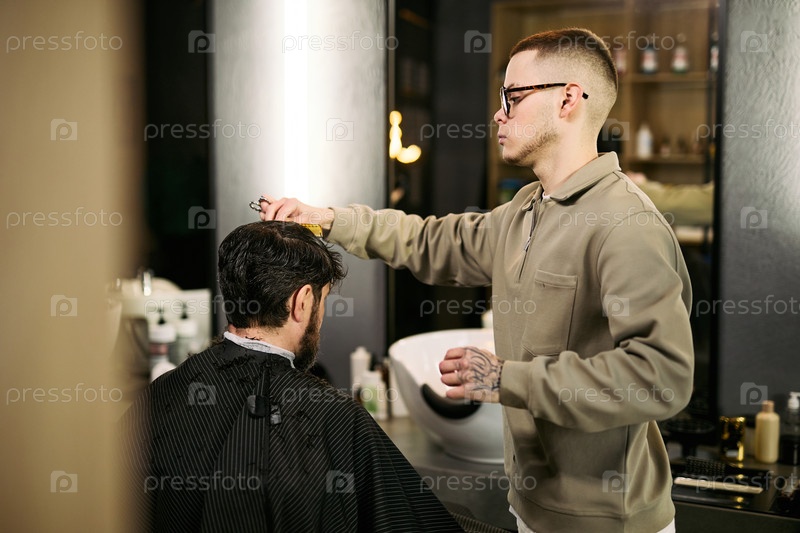 Молодой белый мужчина стрижет волосы бородатого средневекового человека в парикмахерской