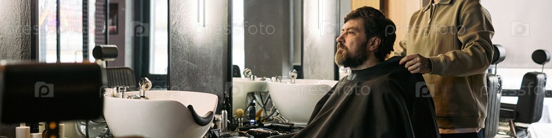 Кавказский мужчина среднего возраста подстригается от молодого взрослого парикмахера в парикмахерской