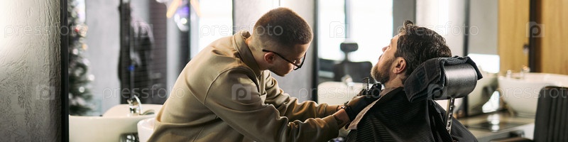 Молодой белый мужчина получает стрижку бороды от молодого кавказского парикмахера