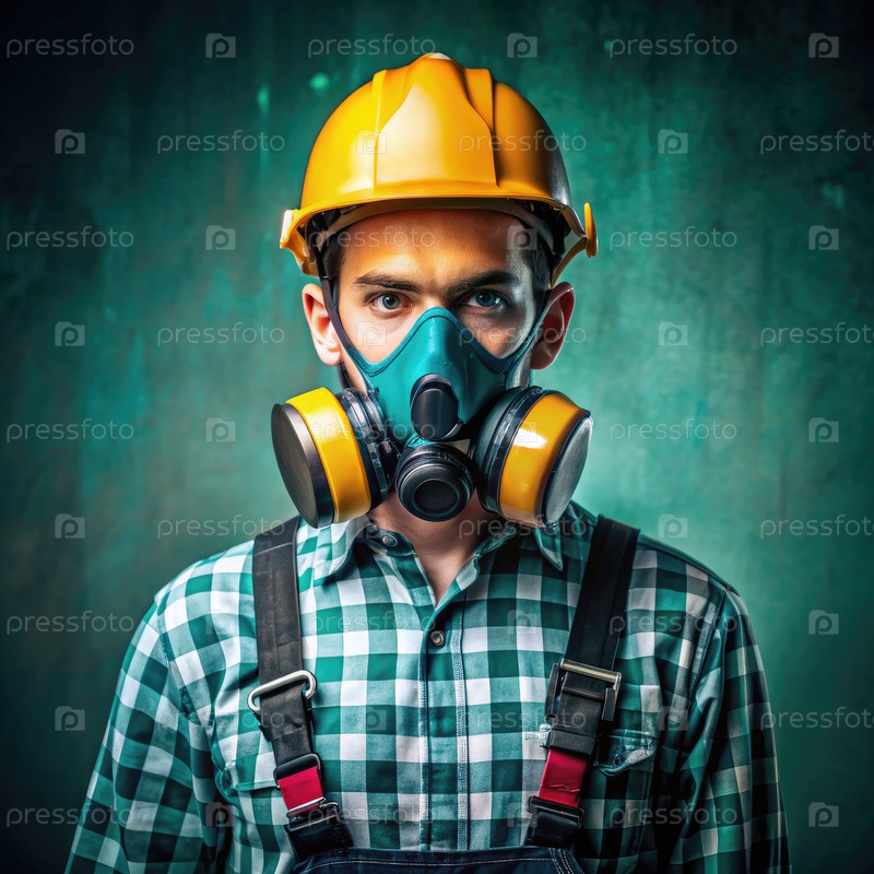 Молодой строительный работник, носящий защитное снаряжение и респираторную маску