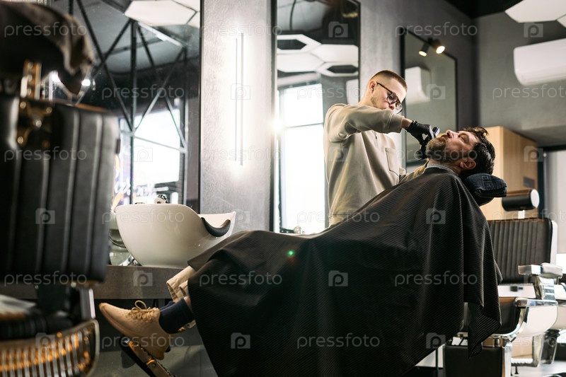 Молодой кавказский парикмахер брит бороду средневекового белого человека в парикмахерской