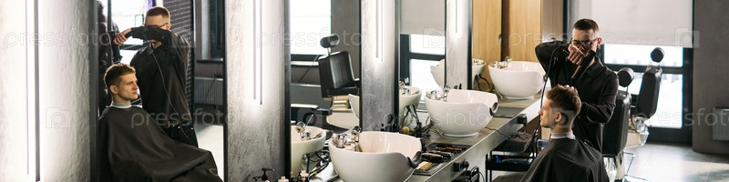 Молодой белый мужчина подстригается от парикмахера в современном парикмахерском