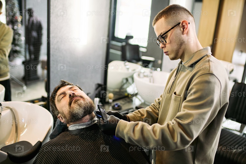 Молодой взрослый кавказский парикмахер уход за собой борода расслабленного мужчины среднего возраста