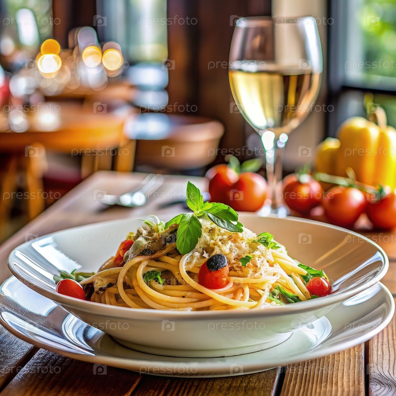 Тарелка спагетти с базиликом и помидорами в ресторане