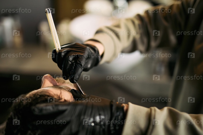 Кавказский молодой взрослый мужчина получает услугу по бритве от парикмахера, носящего перчатки