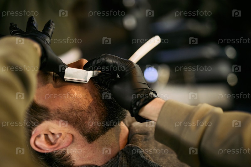 Кавказский мужчина средних лет, получающий бритву от парикмахера в парикмахерской