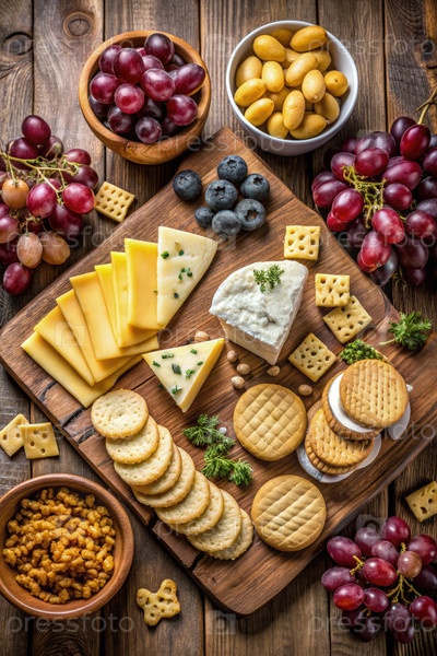 Вкусная тарелка с сыром и крекерами с виноградом и чернилами