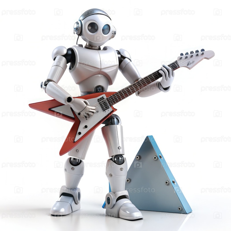 Робот играет на электрической гитаре на треугольной сцене
