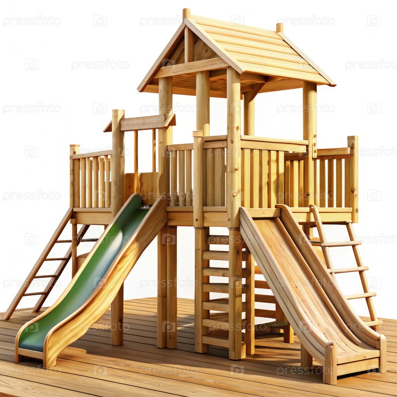 Деревянная структура детской площадки с зеленой горкой и лестницей. генеративный AI