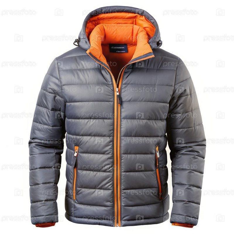 Серый пуфферный пиджак с оранжевыми акцентами и капюшоном. генеративная ИИ