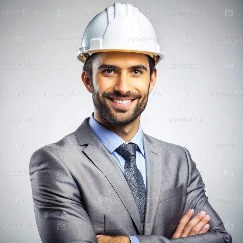 Улыбающийся строительный работник в сером костюме и жесткой шляпе